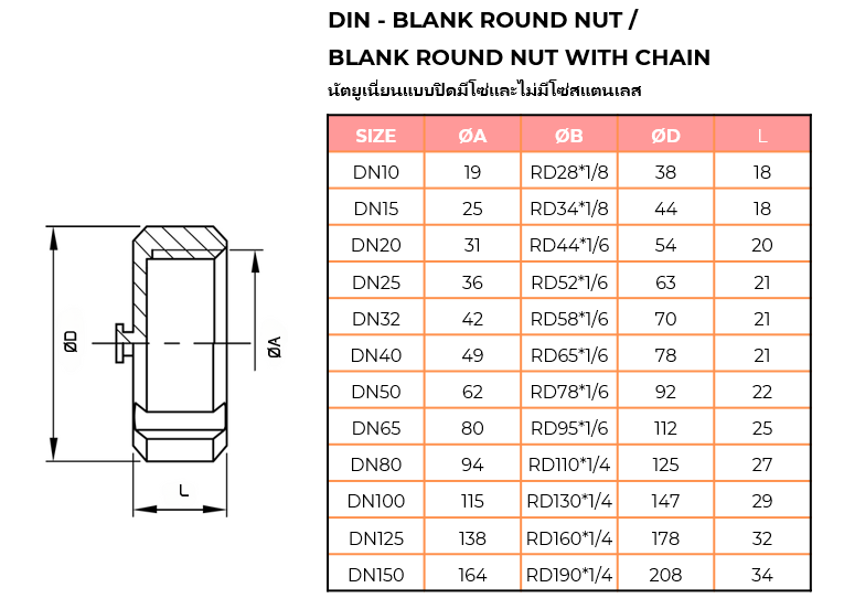 นัตแบบปิดพร้อมโซ่สแตนเลส , ฝาปิดยูเนี่ยนสแตนเลส , SANITARY BLANK NUT WITH CHAIN , BLANK NUT FOOD GRADE เป็นนัตแบบปิดพร้อมโซ่ ผลิตจากสแตนเลส FOOD GRADE เหมาะสำหรับไลน์การผลิตอาหารและยาและผ่านการขัดผิวภายในและภายนอกตามมาตรฐานอาหารและยา(FDA)