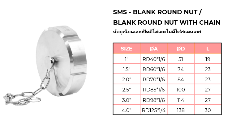 นัตแบบปิดพร้อมโซ่สแตนเลส , ฝาปิดยูเนี่ยนสแตนเลส , SANITARY BLANK NUT WITH CHAIN , BLANK NUT FOOD GRADE เป็นนัตแบบปิดพร้อมโซ่ ผลิตจากสแตนเลส FOOD GRADE เหมาะสำหรับไลน์การผลิตอาหารและยาและผ่านการขัดผิวภายในและภายนอกตามมาตรฐานอาหารและยา(FDA)