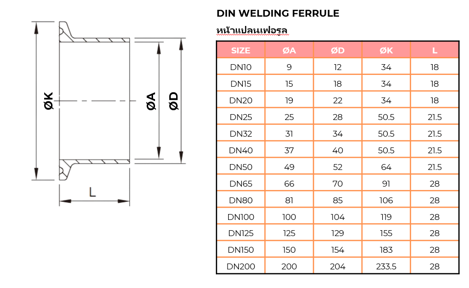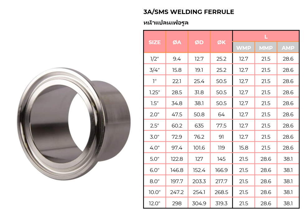 FERRULE (หน้าแปลนเฟอรูล) ใช้สำหรับเชื่อมกับท่อ หรือ ข้อต่อต่างๆ ผลิตจากสแตนเลส FOOD GRADE เหมาะสำหรับไลน์การผลิตอาหารและยาและผ่านการขัดผิวภายในและภายนอกตามมาตรฐานการผลิตอาหารและยา (FDA)